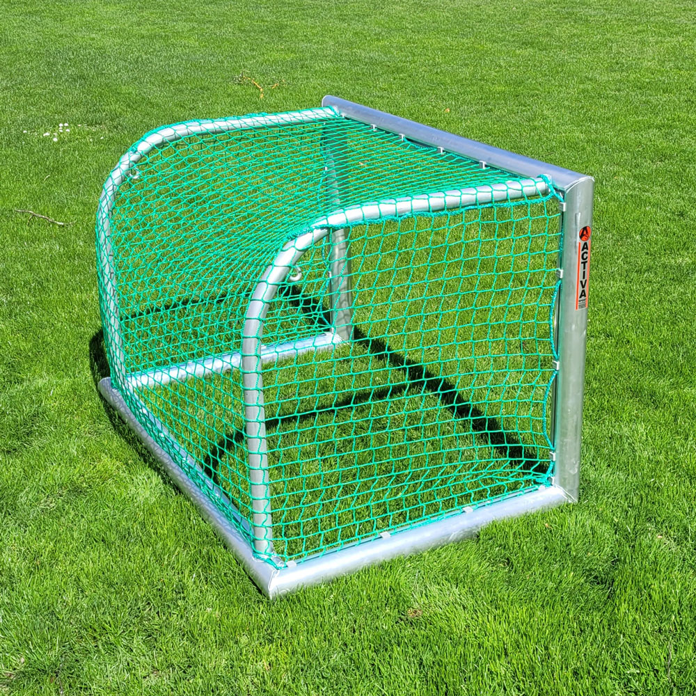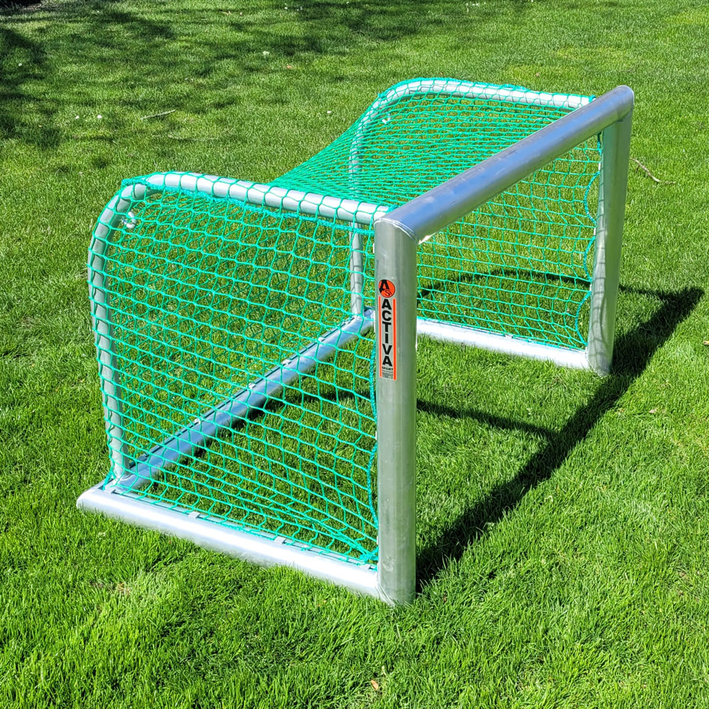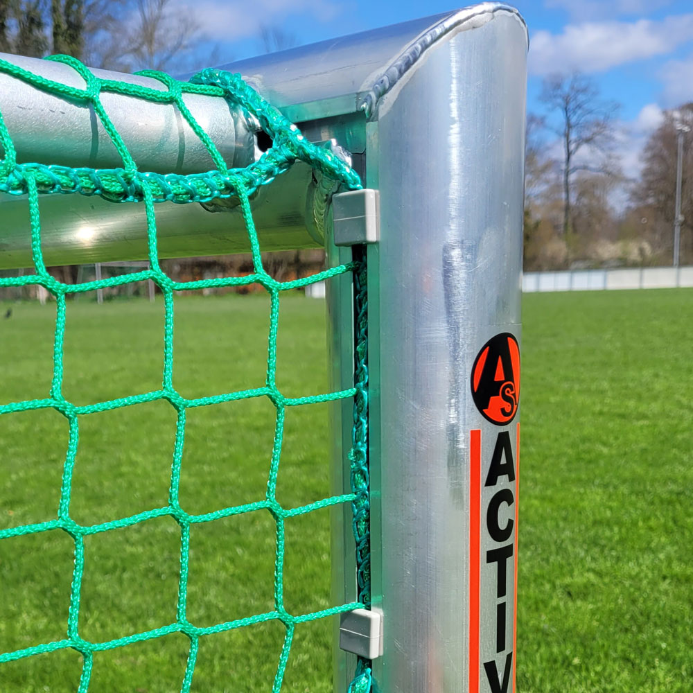 Die Netzbefestigung am Rahmen erfolgt mit flachen, nicht hervorstehenden Kunststoffnetzhaken. Das Tor lässt sich zudem dank seiner nach innen versetzten Netzbügel stapeln, was für eine platzsparende Aufbewahrungsmöglichkeit sorgt.